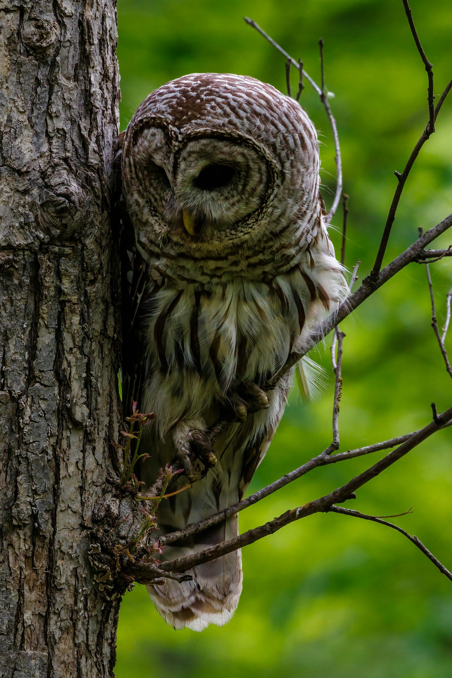 “Barred owl,” he said quietly, listening intently. “There,” he whispered as the call repeated and he pointed out the owl, almost invisible in the canopy above them.