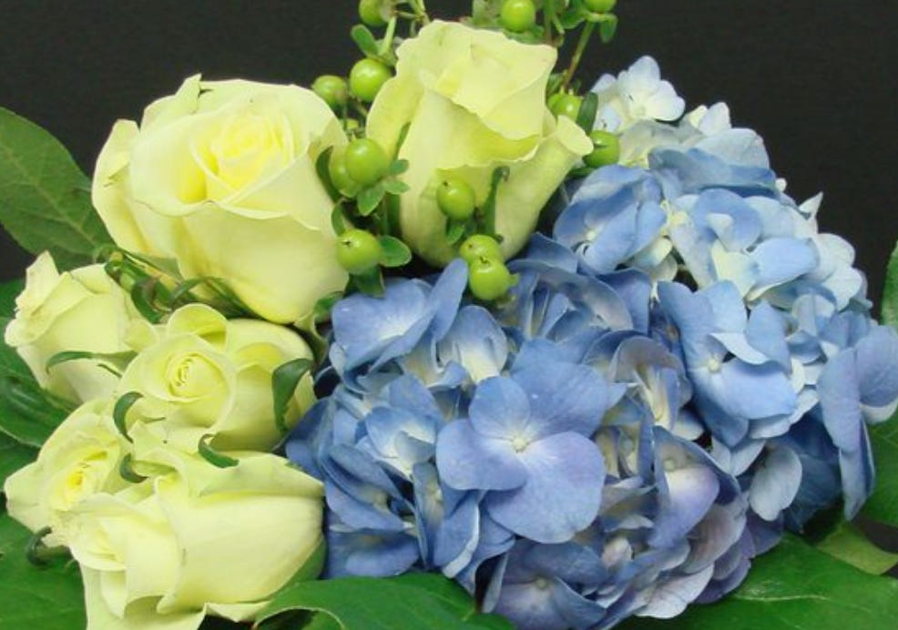 Pale yellow roses, blue hydrangeas and evergreens overflowed the altar and lined both sides of the aisle. Yellow ribbons were tied around the end of each pew and pinned to hundreds of lapels.